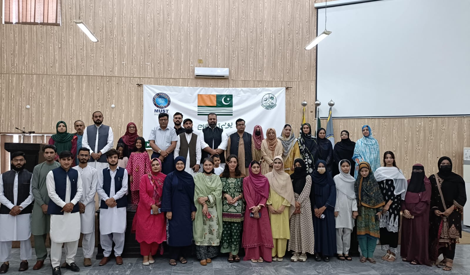 Mr. Muneeb-ur-Rehman from the Department of English recited verses from the Holy Quran followed by Mr. Aqib Alam from the Department of International Relations who presented Naat-e-Rasool-e-Maqbol (PBUH). Dr. Asma Iqbal Kayani, Assistant Professor, Department of English, Mr. Hassan Tariq, Lecturer, International Relations & Muhammad Faizan, student from Department of English spoke about the importance of the Day and the brave struggle of the people of Jammu and Kashmir. They said that the Day reflects the courage & hopes of the Kashmiri people and shows their firm commitment to their cause. They also expressed hope that their continued struggle & sacrifices would one day bring them freedom and rights they deserve. Students from the Departments of English & International Relations including Zarish, Shanfa & their fellows presented National & Kashmiri songs. Their enchanting voices created an atmosphere of pride & unity among the participants. Malaika Pervez & Mehreen Qamar from the same departments gracefully conducted the proceedings of the Youm-e-Tasees.