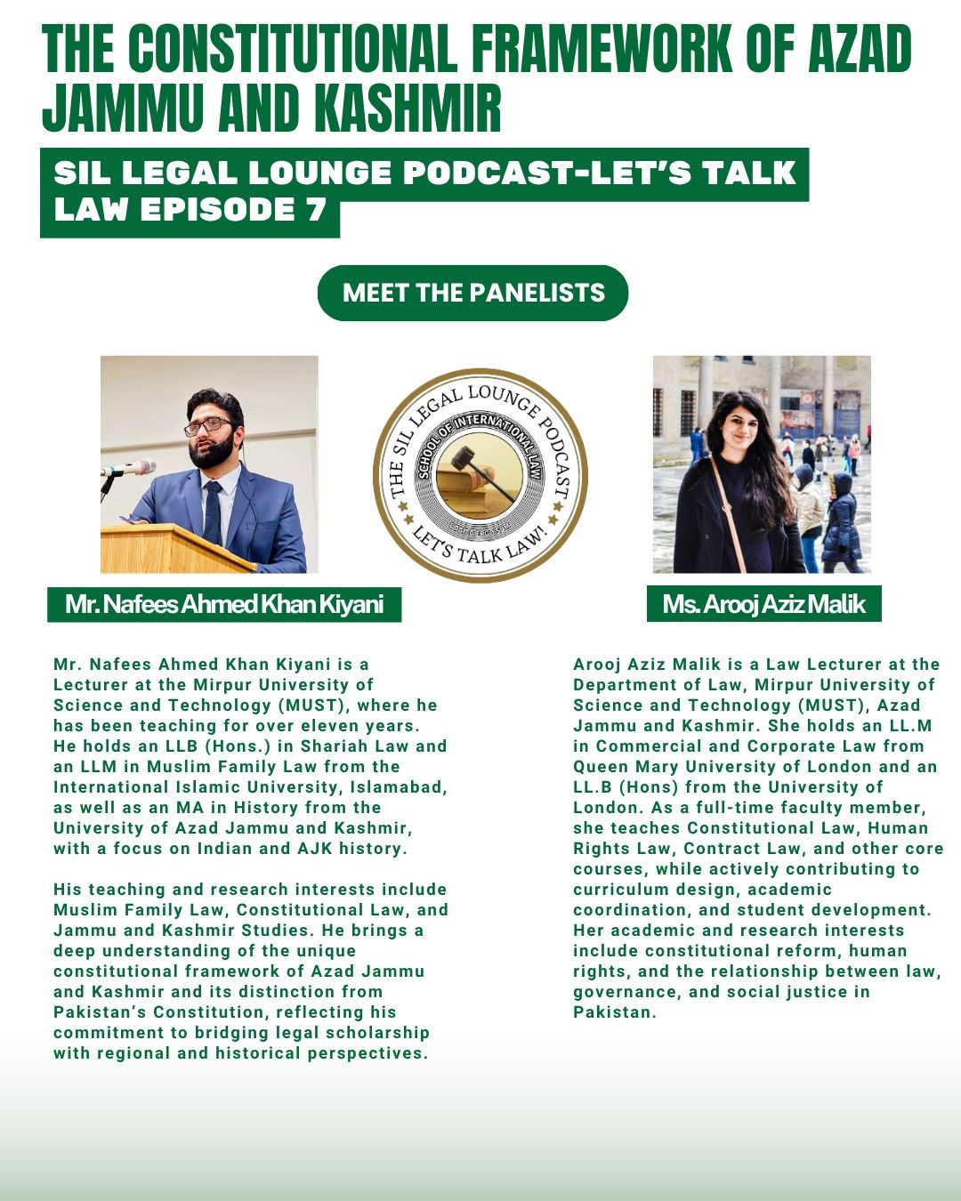 Sir Nafees and Ms. Arooj Aziz Malik from the Department of Law, Mirpur University of Science and Technology (MUST), joined Episode 7 of the SIL Legal Lounge Podcast to discuss “The Constitutional Framework of Azad Jammu and Kashmir.”