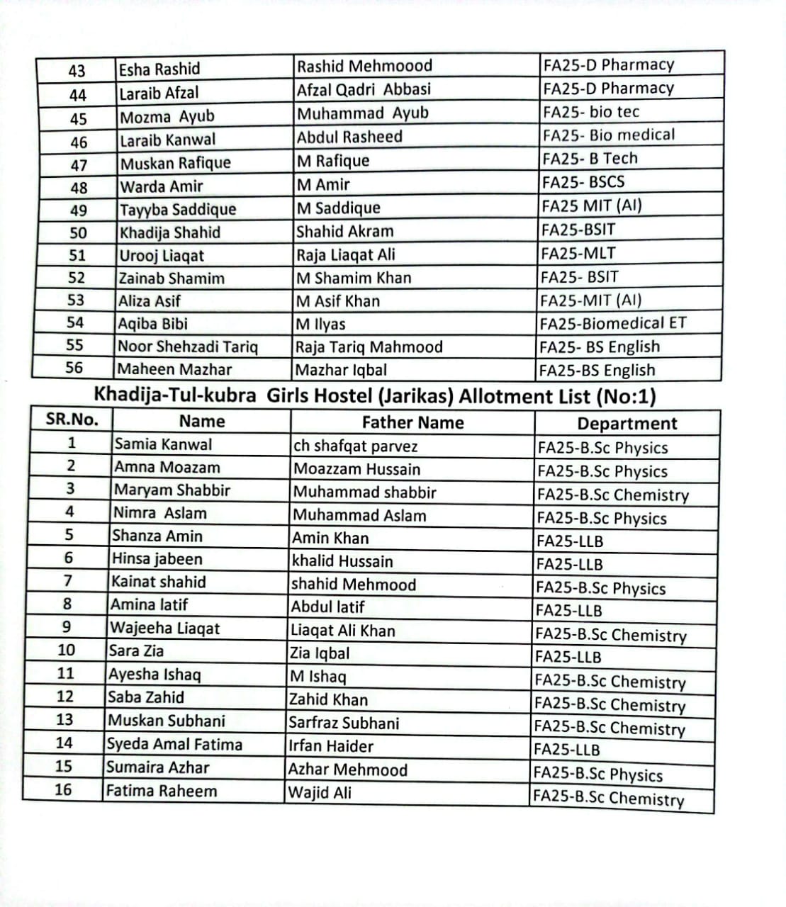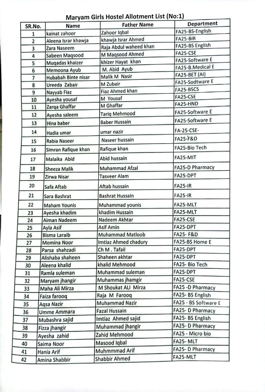 Girls Hostels Allotment List (No.01)