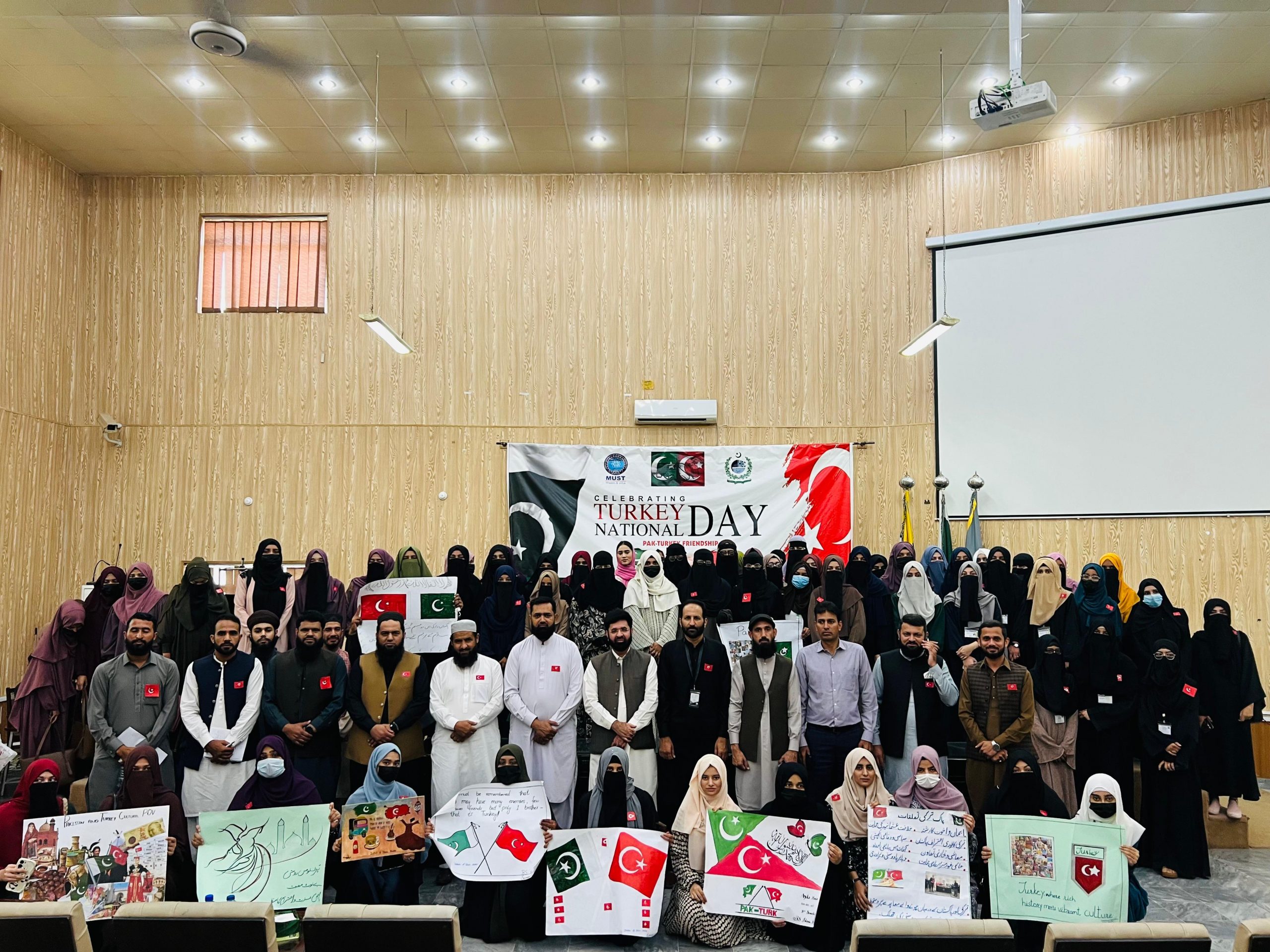 The first day of the Turkish National Day Celebration Week was held with great enthusiasm and patriotic zeal at Mirpur University of Science and Technology (MUST) on October 28, 2025. The event began with a flag-raising ceremony to commemorate the Republic Day of Türkiye. The ceremony was graced by Prof. Dr. Zafar Iqbal, Dean, Faculty of Social Sciences and Humanities including, Prof. Dr. Khalique Ahmed, Treasurer, MUST; Dr. Tahir Aslam, Director, Institute of Islamic Studies; Dr.Serish Shafi, Head, Department of English; Mr. Muhammad Ayub, Director Estate Management, Mr. Ansir Ali Khan, Deputy Director Students Affairs, Mr. Zafar Hussain, Security Officer, Faculty Members, Administrative Staff and Students of the University.