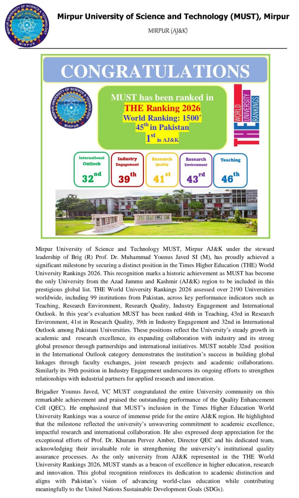 Professional Education Foundation (PEF) ScholarshipsOctober 10, 2025HEC Ranking 2025October 15, 2025 Show all MUST has been ranked in THE Ranking 2026 World Ranking: 1500+, 45th in Pakistan and 1st in AJ&K Related postsOctober 15, 2025HEC Ranking 2025Read moreOctober 10, 2025Professional Education Foundation (PEF) ScholarshipsRead moreOctober 10, 2025Girls Hostels Allotment ListsRead more