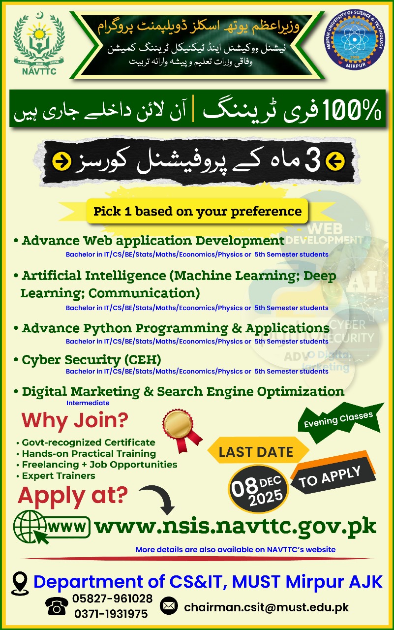 The National Vocational & Technical Training Commission (NAVTTC) has officially opened admissions for Batch 3 (2025–2026) of its 100% free, government-sponsored professional training programmes. The courses are being offered at the Department of Computer Science & IT (CS&IT), Mirpur University of Science & Technology (MUST).