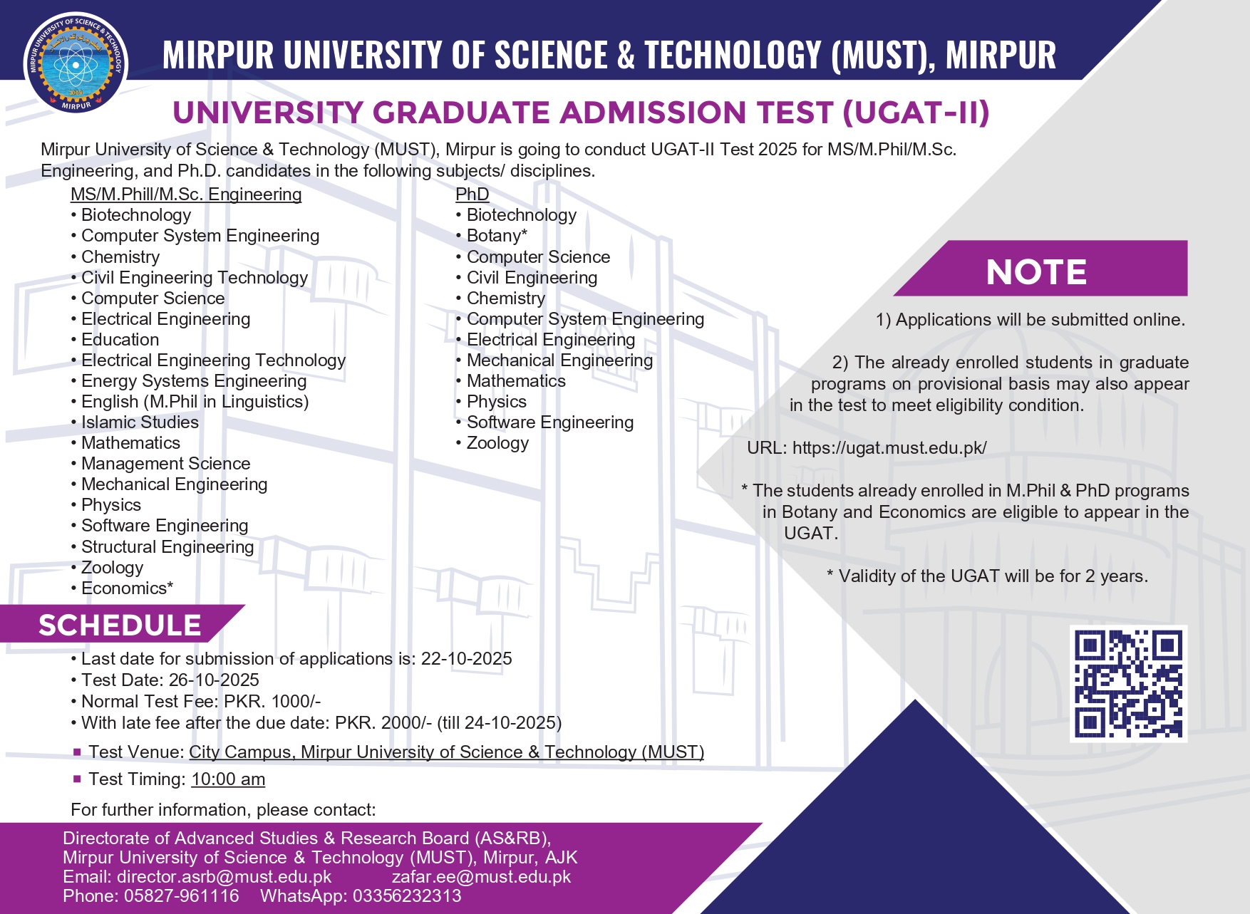 HEC Ranking 2025October 15, 2025MUST, Mirpur organises a Seminar on Maintenance Management of Hydroelectric StationsOctober 20, 2025 Show all University Graduate Admission Test (UGAT-ll) 2025 Related postsInfection Control in Lab and Operation TheaterRead moreVice Chancellor MUST, Mirpur AJ&K & Mr. Liu Yonggang, CEO of Karot Power Company Limited (KPCL) signed Memorandum of Understanding (MoU)Read moreنیشنل ایگری کلچر کونسل کے وفد کا اہم دورہRead more